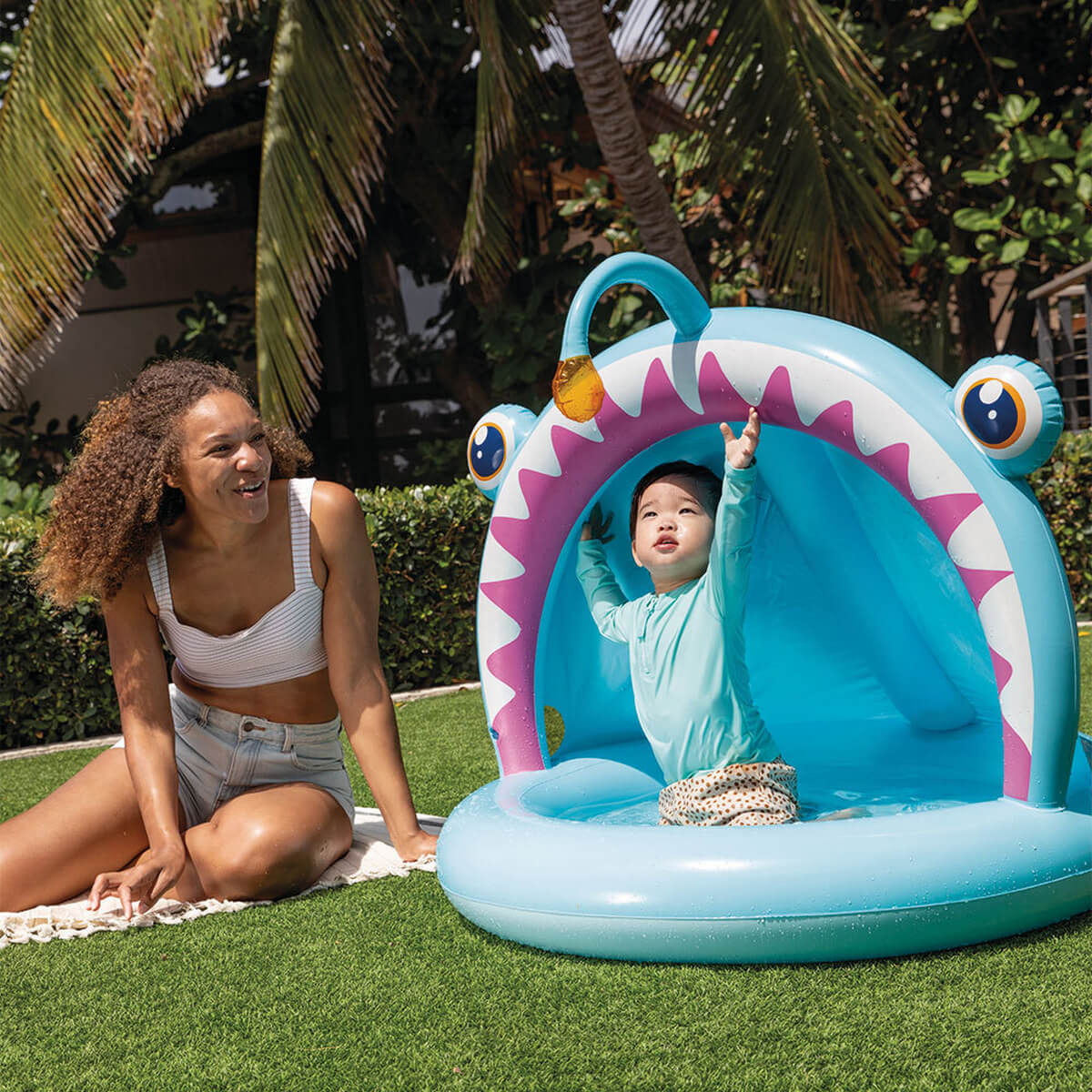 Детский бассейн "Рыба с фонариком" Intex 58419 - отличный бассейн для детей от 1 до 3 лет. Надувное дно, низкие и широкие бортики предостерегут от травм ребёнка во время игры, а навес защитит от солнца.